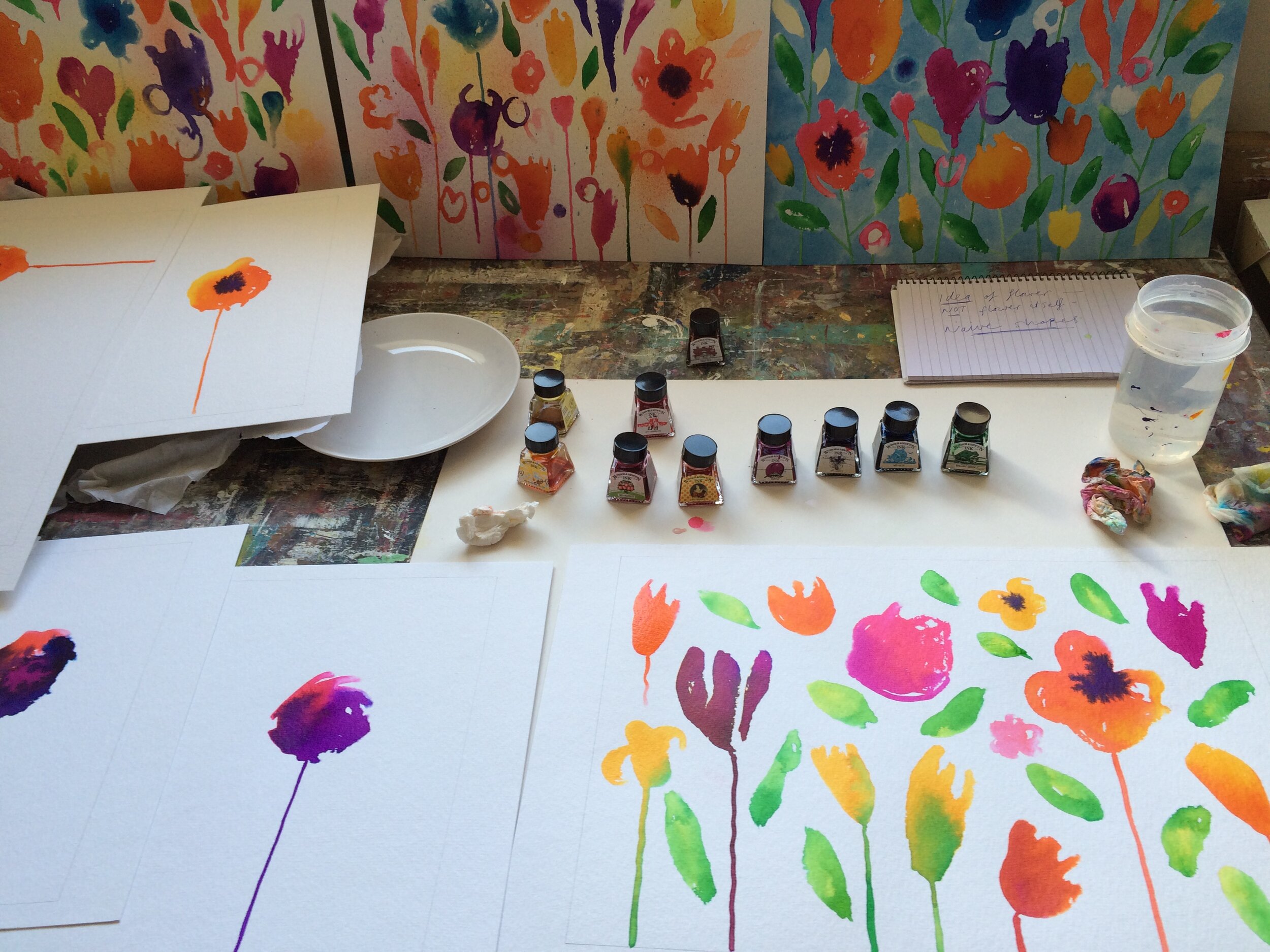 “The Inkflowers Series uses brightly coloured drawing ink on the rough side of Hahnemühle traditional fine art paper. There is a degree of control in using the brush to apply the ink. The textured paper gives rise to spontaneous edges and the element of chance comes into play.